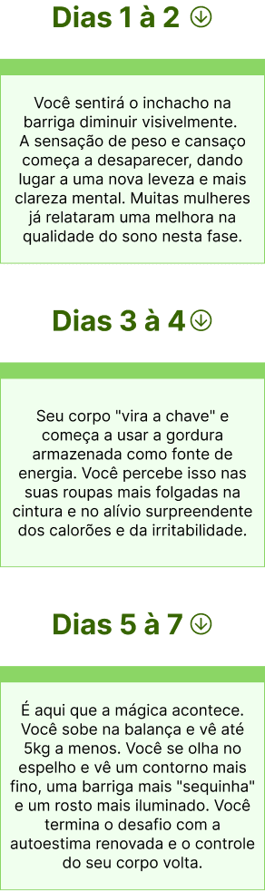 Você sentirá o inchacho na barriga diminuir visivelmente. A sensação de peso e cansaço começa a desaparecer, dando lugar a uma nova leveza e mais clareza mental. Muitas mulheres já relataram uma melhora na qualidade do sono nesta fase.